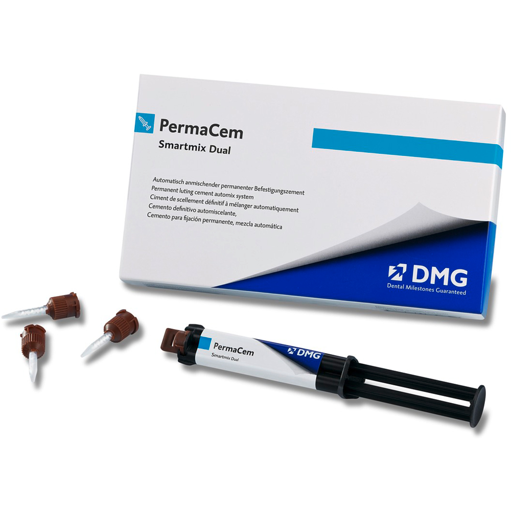 Цемент PermaCem Dual Smartmix компомерный, 2 шприца по 10г, 10 насадок. Показания: Постоянное крепление коронок, мостов, вкладок, накладок и виниров из металлов, керамики, композитов